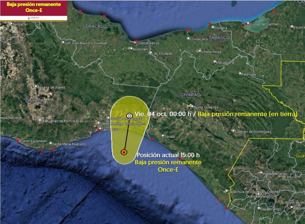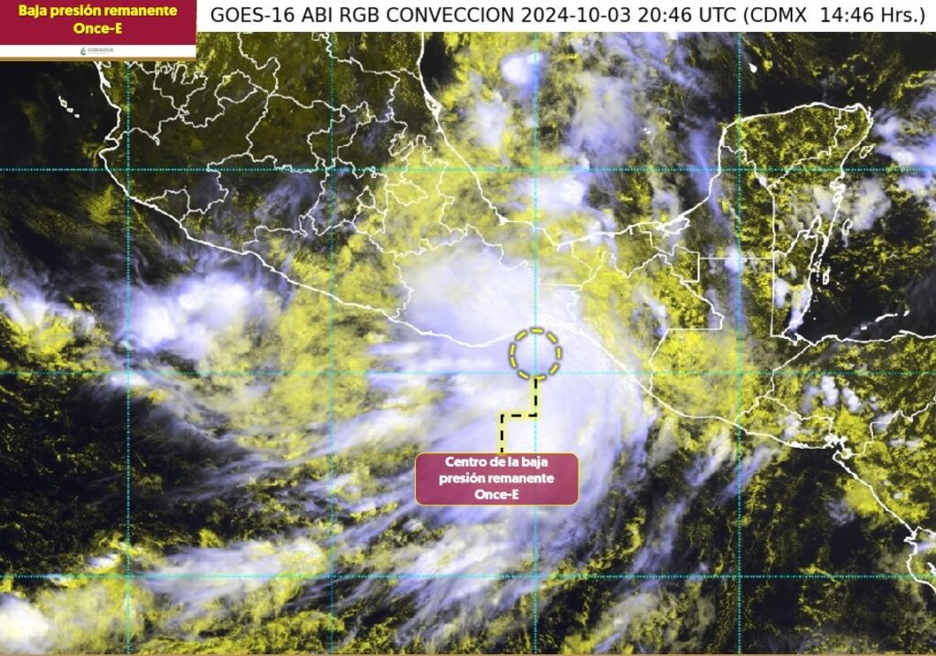 La depresión tropical Once-E se ha degradado a baja presión remanente, sus remanentes, en interacción con la vaguada monzónica y con una zona de baja presión en el suroeste del golfo de México, mantendrán lluvias intensas con puntuales torrenciales en el oriente, sur y sureste de México, además, reforzará el potencial de lluvias en regiones del centro del país.