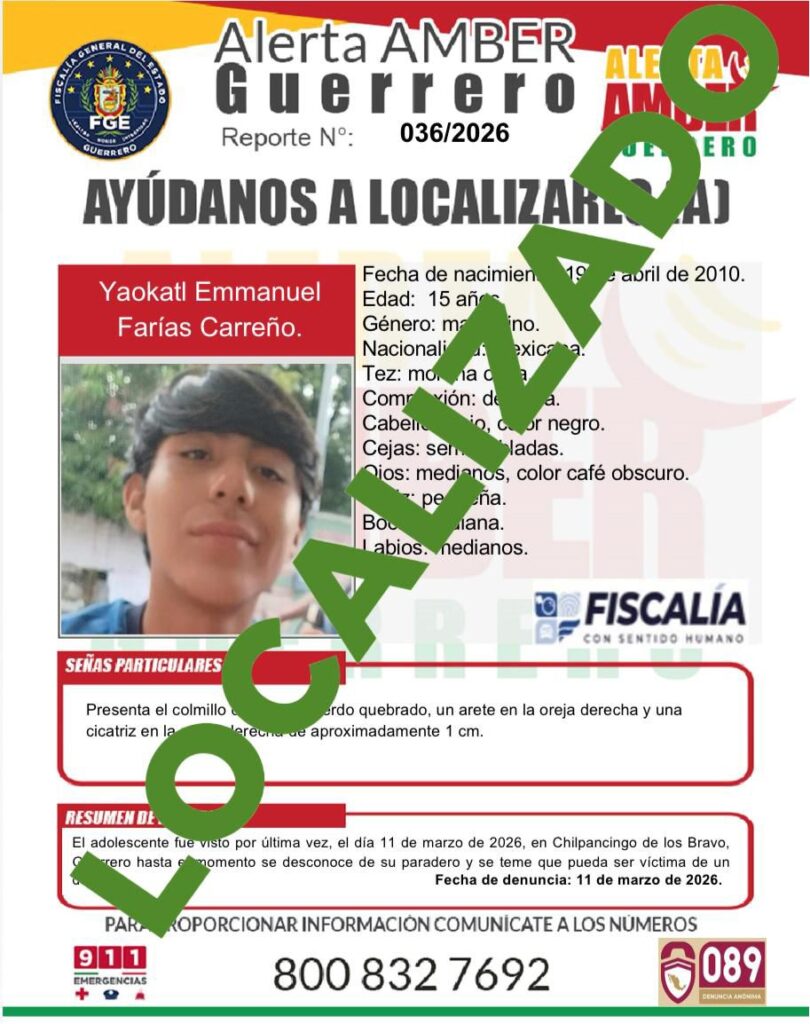 Chilpancingo, Gro., a 22 de marzo de 2026.– La Fiscalía General del Estado de Guerrero logró la localización sana y salva del adolescente de iniciales Y. E. F. C., de 15 años de edad, quien era buscado mediante una ficha activa del protocolo Alerta Amber Guerrero.