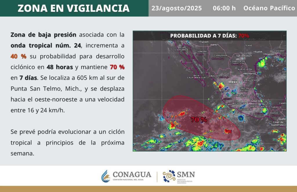 Por último, se mantiene en vigilancia a una posible Zona de Baja Presión, asociada con la onda tropical número 24, incrementando a 40 por ciento su probabilidad para desarrollo ciclónico 48 horas y mantiene 70 por ciento en siete días, se localiza a 605 kilómetros al sur de Punta San Telmo, Michoacán y se desplaza hacia el oeste- noroeste a una velocidad entre 16 y 24 kilómetros por hora.