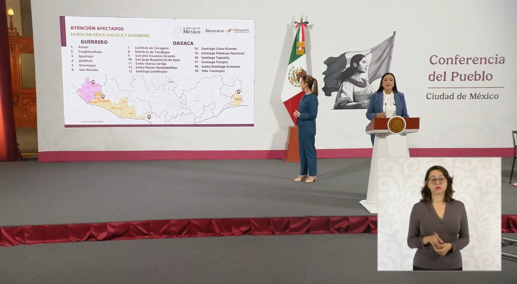 Ciudad de México, 28 de julio de 2025.– Durante la conferencia matutina de la presidenta de México, Claudia Sheinbaum, la secretaria de Bienestar, Ariadna Montiel Reyes, informó que se atendieron a un total de 59 mil 519 familias afectadas por el huracán Erick en los estados de Guerrero y Oaxaca, donde se brindó atención prioritaria a las zonas más dañadas por el fenómeno natural.