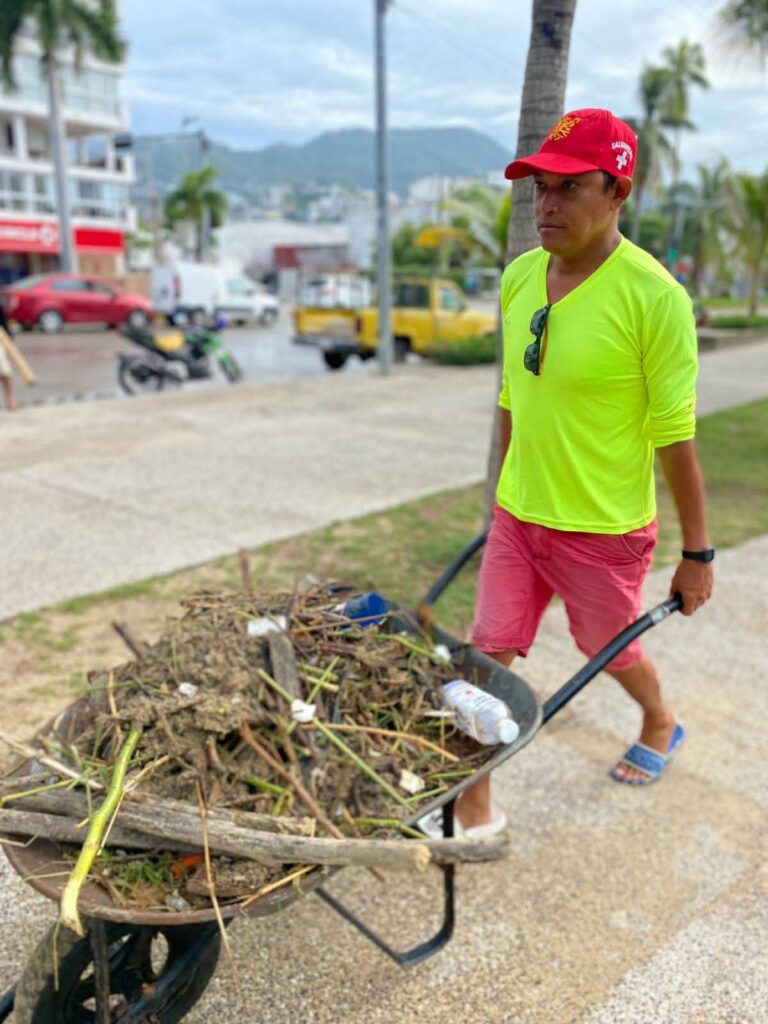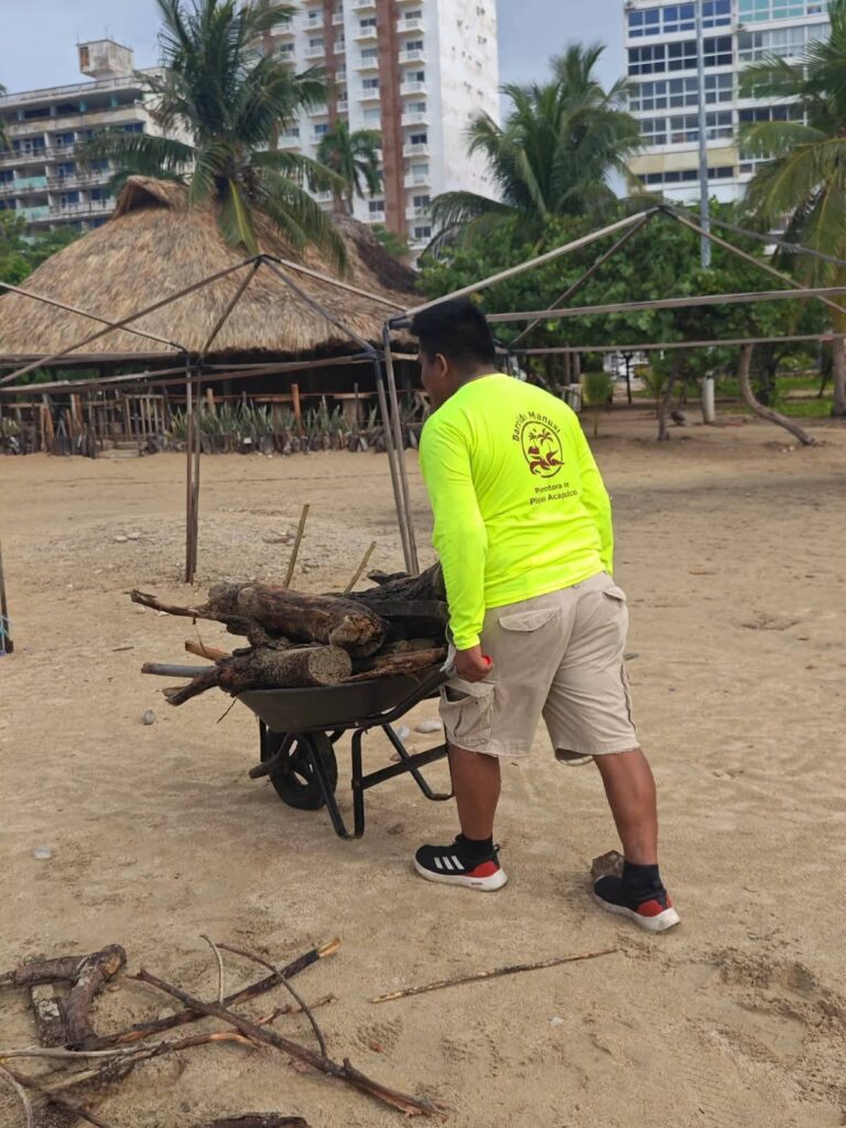 Tras las fuertes lluvias registradas en el puerto, personal operativo de la Promotora de Playas Acapulco, realizó desde temprana hora labores de limpieza y barrido manual en la franja de arena, donde se retiraron troncos, plásticos, unicel, vidrio y otros objetos arrastrados por la corriente hasta la bahía.