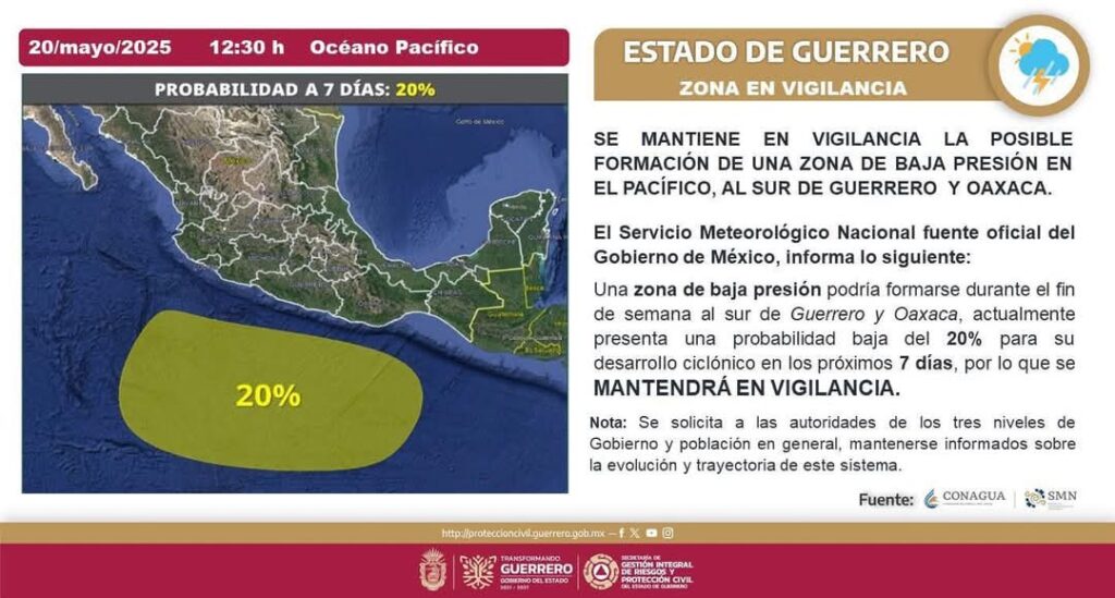 Nos mantenemos en vigilancia ante una posible zona de baja presión al sur de Guerrero y Oaxaca. 🌧️ De acuerdo con el Servicio Meteorológico Nacional, existe un 20% de probabilidad de desarrollo ciclónico en los próximos 7 días.