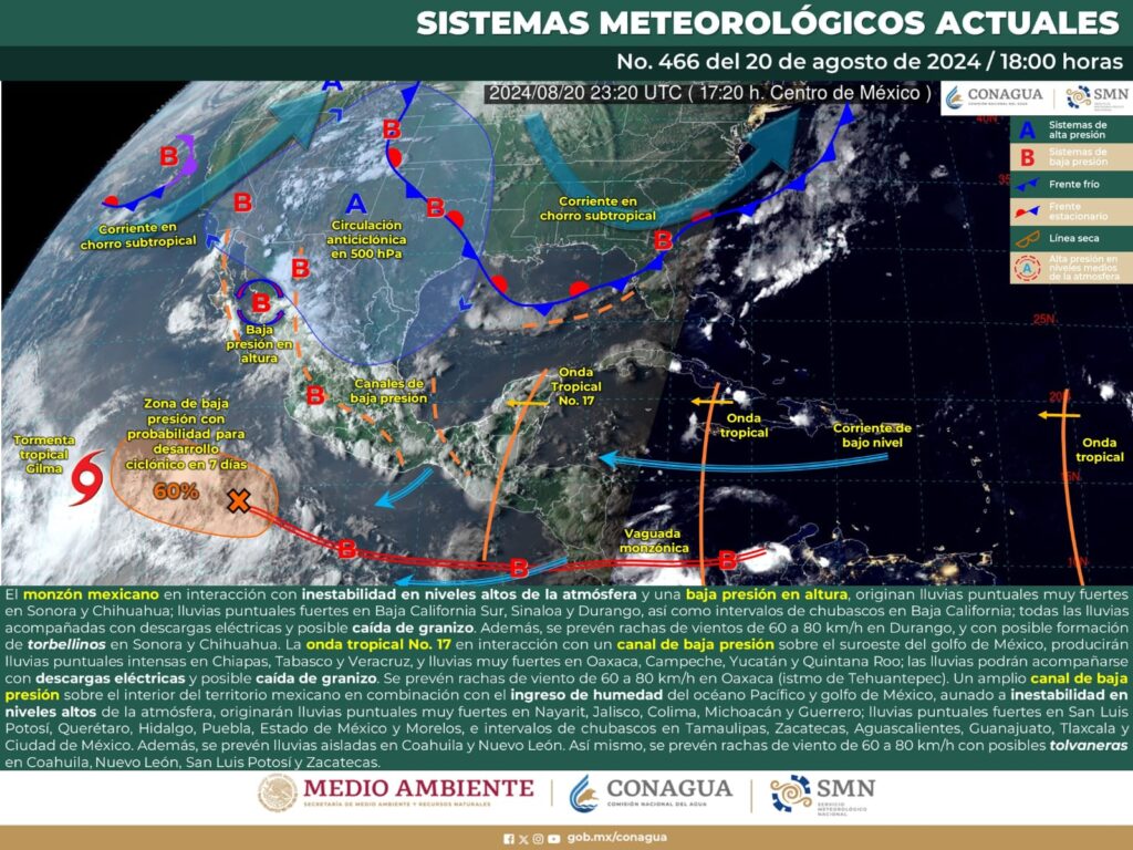 La Coordinación General de Protección Civil destacó que un canal de baja presión sobre el interior del territorio mexicano, en combinación con el ingreso de humedad del océano Pacífico y golfo de México, aunado a inestabilidad en niveles altos de la atmósfera, originarán las precipitaciones.