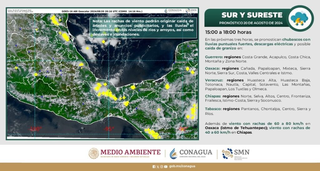 A su vez, el Gobierno Municipal que encabeza la Presidenta Abelina López Rodríguez reitera a la población que estas lluvias pueden generar encharcamientos y deslaves, así como el incremento en los niveles de ríos y arroyos. Se prevé viento de dirección variable de 10 a 25 kilómetros por hora.