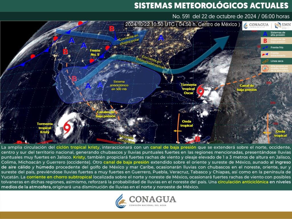 Durante este día, se pronostica que el ciclón tropical kristy se desplace hacia el occidente, frente a las costas de Michoacán, Jalisco y Colima, hacia aguas más cálidas, lo cual permitirá el fortalecimiento del sistema previéndose que pueda intensificarse a huracán categoría 1 en la escala Saffir-Simpson, su amplia circulación, interaccionará con un canal de baja presión que se extenderá sobre el norte, occidente, centro y sur del territorio nacional, generando chubascos y lluvias puntuales fuertes en las regiones mencionadas, presentándose lluvias puntuales muy fuertes en Jalisco. Kristy, también propiciará fuertes rachas de viento y oleaje elevado de 1 a 3 metros de altura en Jalisco, Colima, Michoacán y Oaxaca (oriente). Por otra parte, otro canal de baja presión extendido sobre el oriente y sureste de México, aunado al ingreso de aire cálido y húmedo procedente del golfo de México y mar Caribe, ocasionarán lluvias con chubascos en el noreste, oriente, sur y sureste del país, previéndose lluvias fuertes a muy fuertes en Guerrero, Puebla, Veracruz, Tabasco y Chiapas, así como en la península de Yucatán.