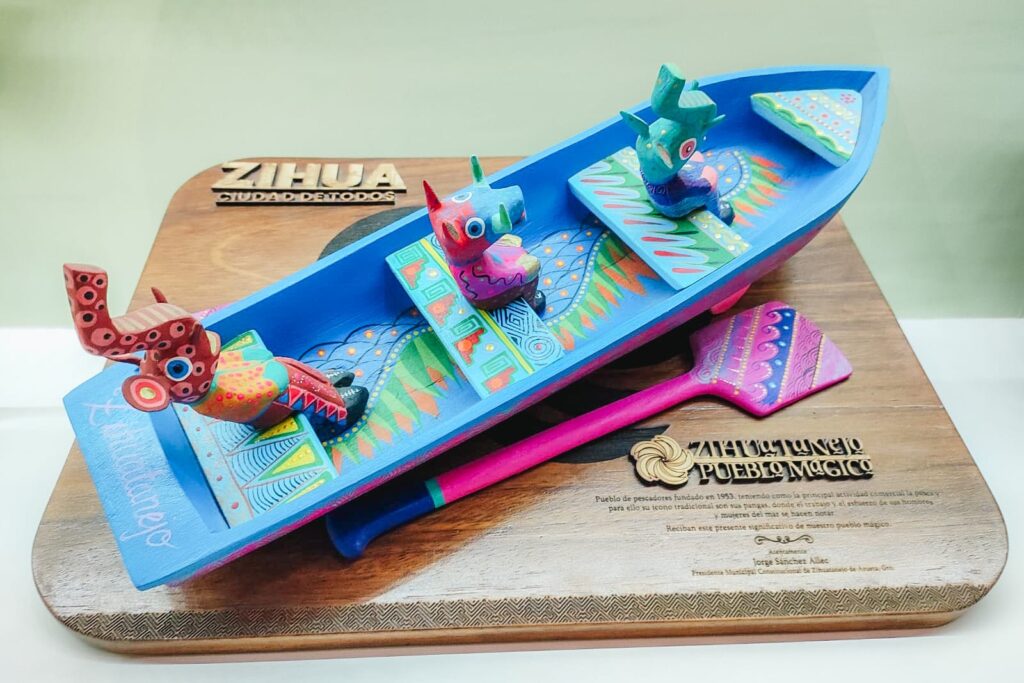 Por su parte, Zihuatanejo muestra una lancha tipo panga con remos y tres personajes. La artesanía está policromada y muestra la esencia de este pueblo de pescadores que ha escalado hasta convertirse en un destino turístico de talla internacional.