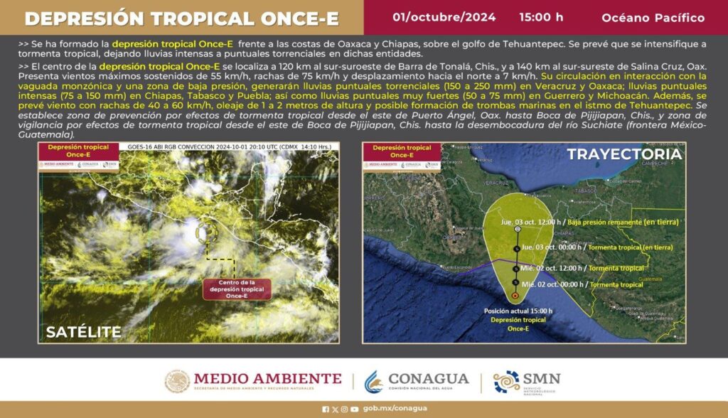 El SMN detalla que el centro de la depresión tropical Once-E se localiza a 120 kilómetros al sur-suroeste de Barra de Tonalá, Chiapas, y a 140 kilómetros al sur-sureste de Salina Cruz, Oaxaca.