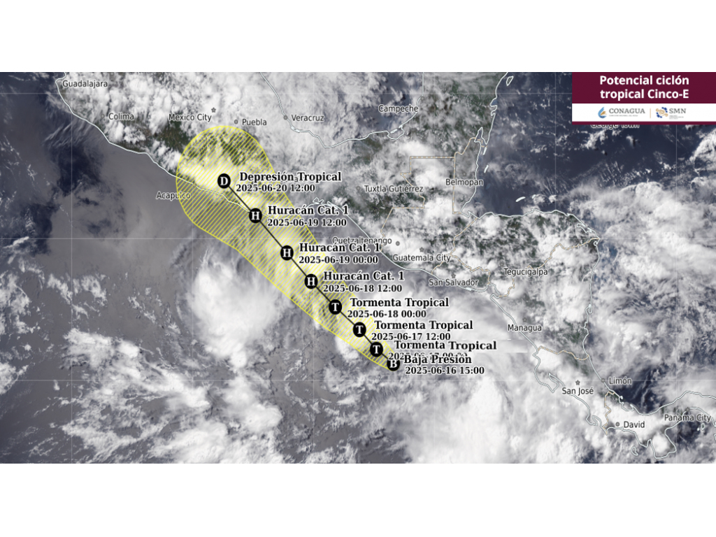El gobierno del estado a través de la Secretaría de Gestión Integral de Riesgos y Protección Civil, informa que la tarde de este lunes se formó el potencial Ciclón Tropical Cinco-E al sur de las costas de Chiapas, se espera que continúe su trayecto de manera paralela a las costas del Pacífico Mexicano, favoreciendo un temporal de lluvias durante las próximos días.