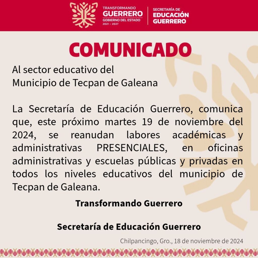 Chilpancingo, Gro, 18 de noviembre del 2024.- El secretario de Educación en Guerrero, Marcial Rodríguez Saldaña, informó que este martes 19 de noviembre se reanudarán clases presenciales y actividades administrativas en el municipio de Tecpan de Galeana, en todos los niveles educativos públicos y privados, luego de dialogar con la presidenta municipal Alba Soberanis Hernández, y el delegado de la SEG en la Costa Grande, con representantes sindicales y de docentes estatales.