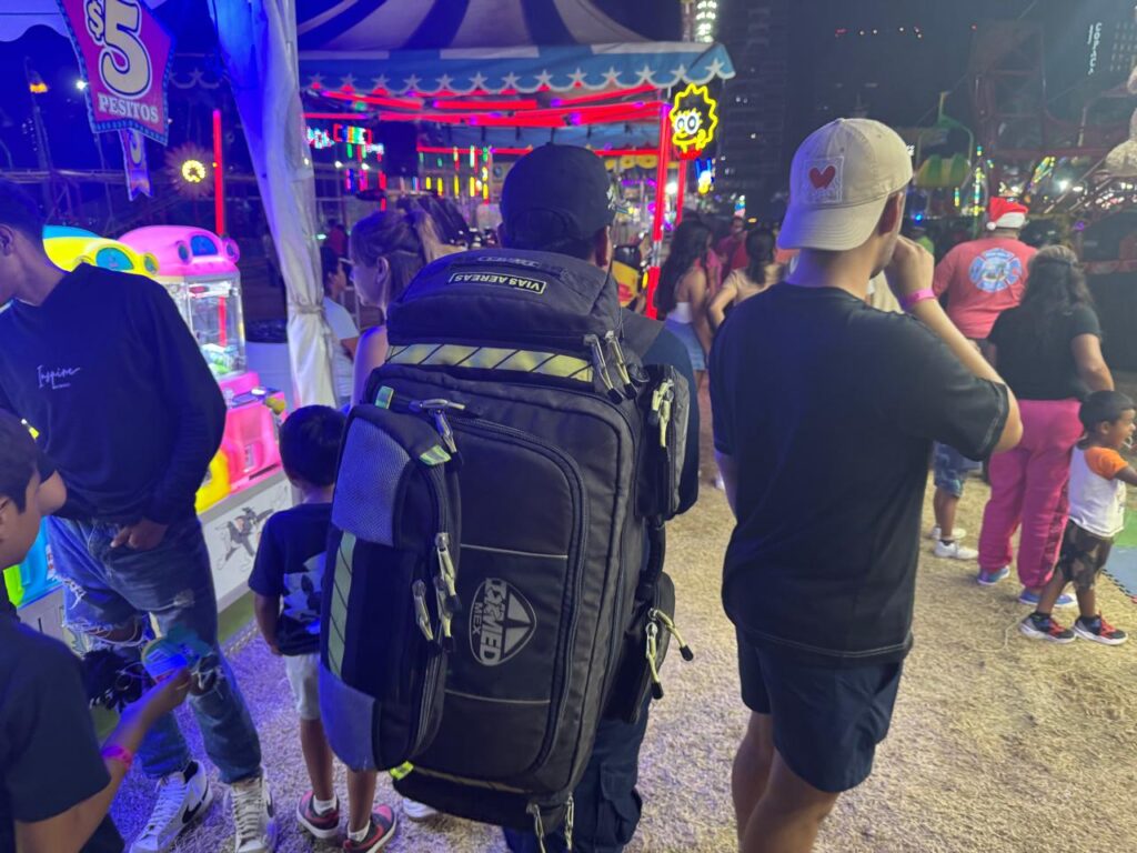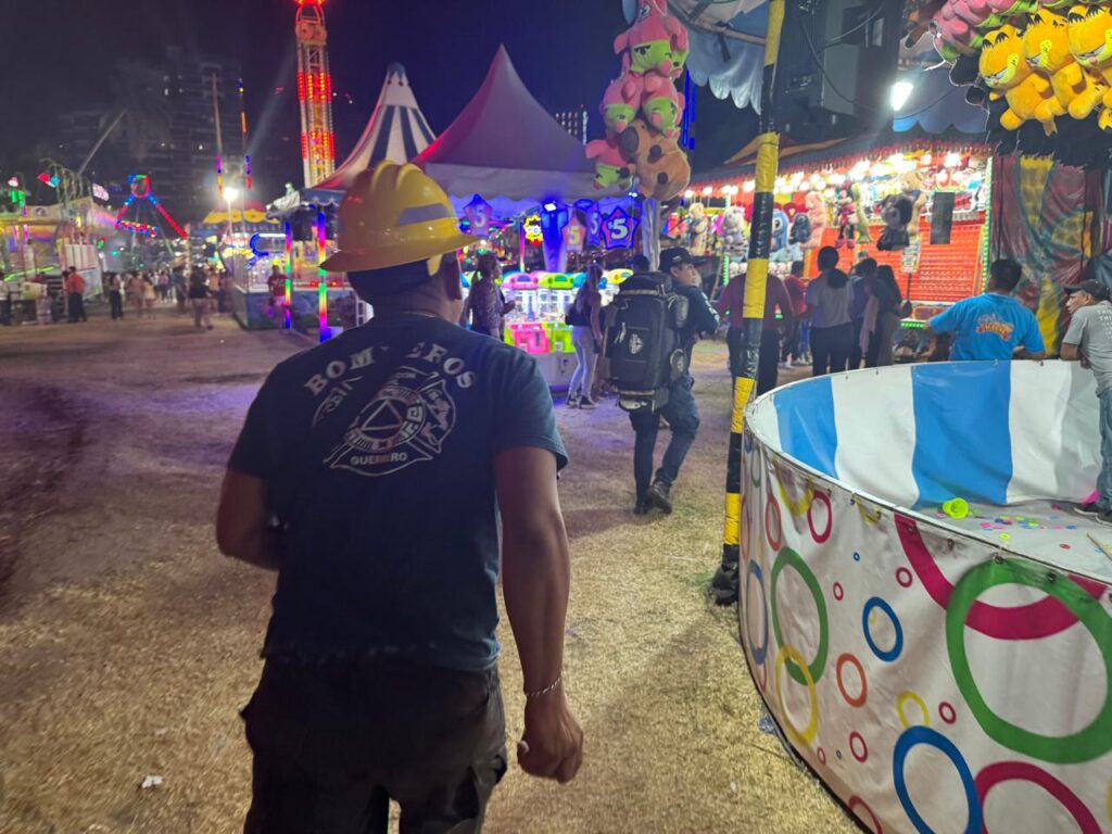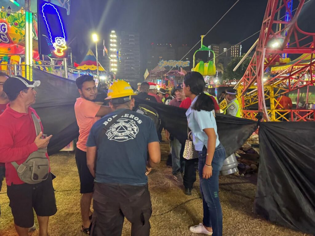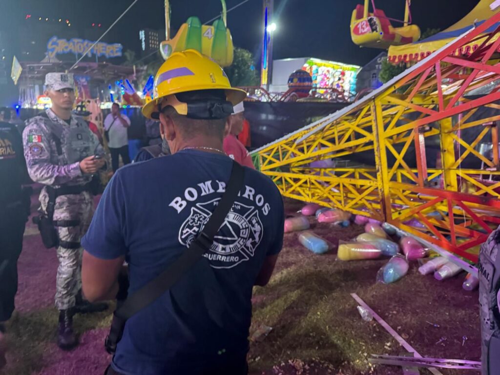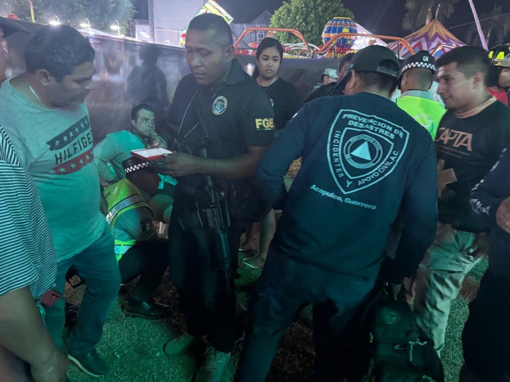Acapulco, Gro., 23 de diciembre de 2024.- Personal operativo de la Secretaría de Gestión Integral de Riesgos y Protección Civil, en coordinación con otras instituciones de los tres órdenes de gobierno, atendieron el incidente que se registró esta noche en un juego mecánico, al interior de la feria del Club de Golf de Acapulco, donde dos personas resultaron con lesiones menores.