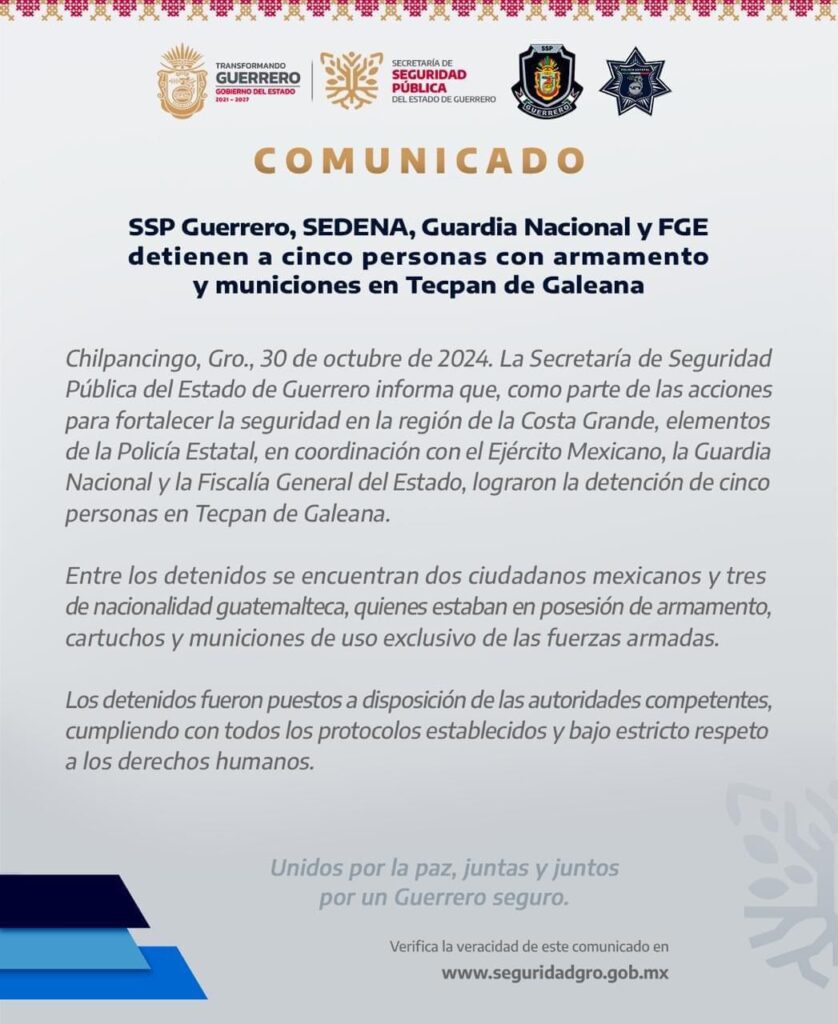 Chilpancingo, Gro., 30 de octubre de 2024. La Secretaría de Seguridad Pública del Estado de Guerrero informa que, como parte de las acciones para fortalecer la seguridad en la región de la Costa Grande, elementos de la Policía Estatal, en coordinación con el Ejército Mexicano, la Guardia Nacional y la Fiscalía General del Estado, lograron la detención de cinco personas en Tecpan de Galeana.