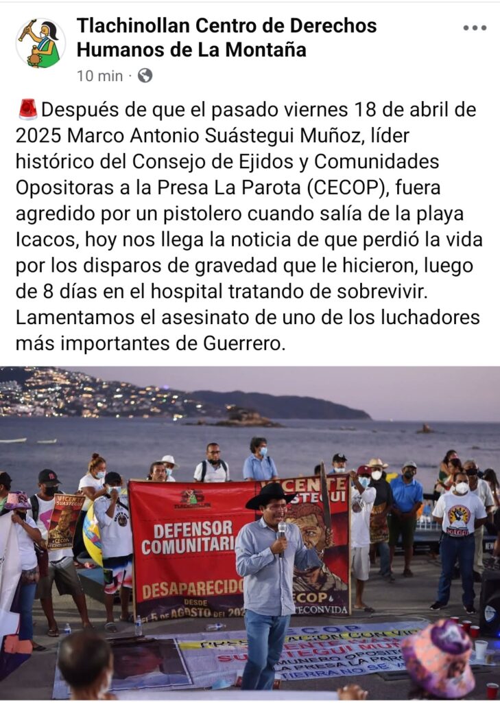 馃毃Despu茅s de que el pasado viernes 18 de abril de 2025 Marco Antonio Su谩stegui Mu帽oz, l铆der hist贸rico del Consejo de Ejidos y Comunidades Opositoras a la Presa La Parota (CECOP), fuera agredido por un pistolero cuando sal铆a de la playa Icacos, hoy nos llega la noticia de que perdi贸 la vida por los disparos de gravedad que le hicieron, luego de 8 d铆as en el hospital tratando de sobrevivir. Lamentamos el asesinato de uno de los luchadores m谩s importantes de Guerrero.