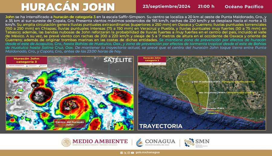 El huracán Jhon ya es categoría 3 y se espera que toque tierra entre 11 y 12 de la noche en los municipios de la costa chica, afectando a Copala, Marquelia, Cruz grande y Cuajinicuilapa, ya se ha desplegado un operativo de apoyo, informaron la gobernadora Evelyn Salgado y la coordinadora nacional de protección civil Laura Velázquez Alzúa.