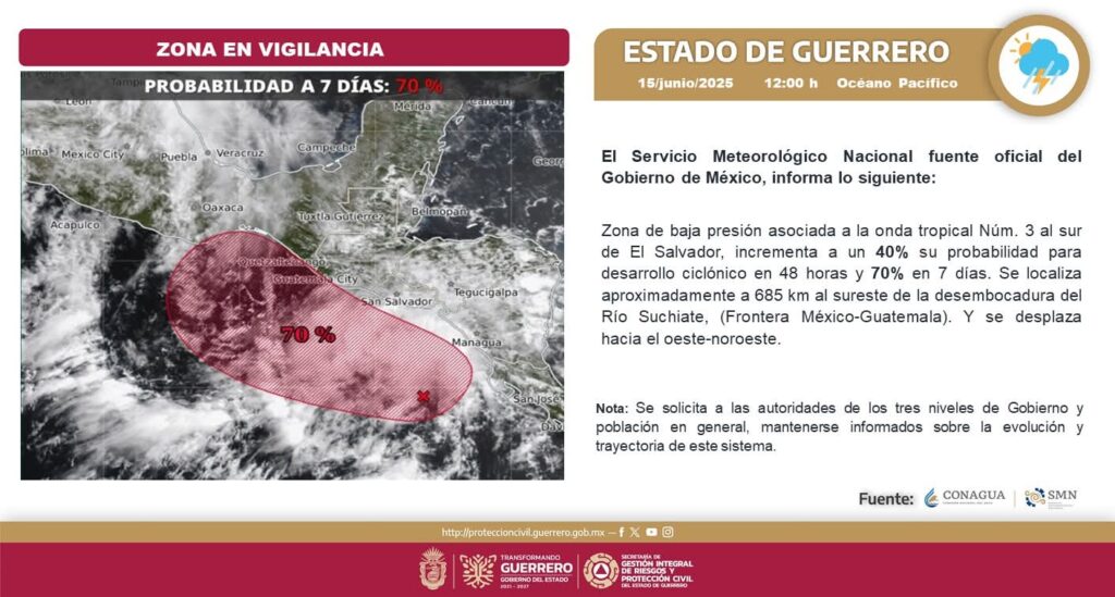 Zona de baja presión asociada a la onda tropical Núm. 3 al sur de El Salvador, incrementa a un 40% su probabilidad para desarrollo ciclónico en 48 horas y 70% en 7 días. Se localiza aproximadamente a 685 km al sureste de la desembocadura del Río Suchiate, (Frontera México-Guatemala). Y se desplaza hacia el oeste-noroeste.