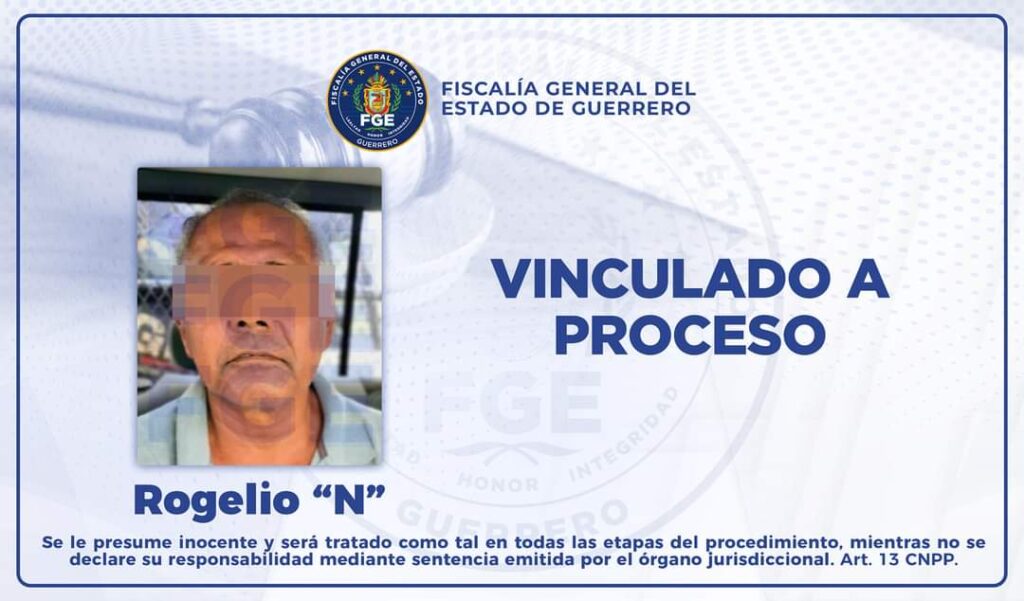 Rogelio “N” fue presentado ante el juez de control que lo requería, quien tras analizar las pruebas presentadas por esta Fiscalía, en audiencia realizada el 4 de octubre de este año, resolvió dictar auto de vinculacion a proceso subsistiendo la medida cautelar de prisión preventiva oficiosa dictada en la audiencia inicial, por lo que permanecerá recluido en el Centro de Reinserción Social (CERESO) de Ometepec, en tanto continúan las indagatorias complementarias.