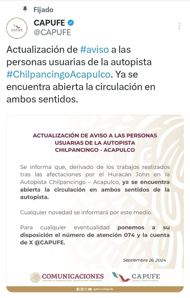 Actualización de #aviso a las personas usuarias de la autopista #ChilpancingoAcapulco. Ya se encuentra abierta la circulación en ambos sentidos.