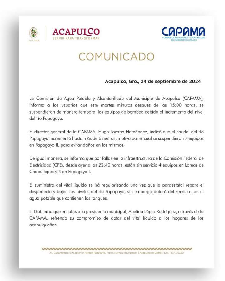 La Comisión de Agua Potable y Alcantarillado del Municipio de Acapulco (CAPAMA), informa a los usuarios que este martes minutos después de las 15:00 horas, se suspendieron de manera temporal…