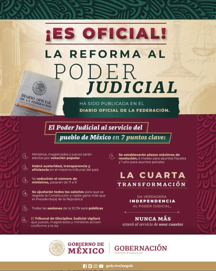 Ha sido publicada la Reforma al PoderJudicial en el Diario Oficial de la Federación. A partir de este momento ha entrado en vigor.